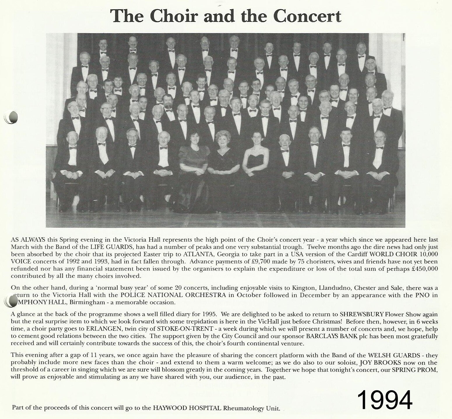 There then followed a ‘purple patch’ for the choir during which they were regularly performing twenty concerts a year. In 1970 the choir started to present an annual concert series at the prestigious Victoria Hall in Hanley, Stoke-on-Trent which ran for over forty years. These concerts saw the choir sharing the stage with some of the most prestigious military and civilian bands in the UK.